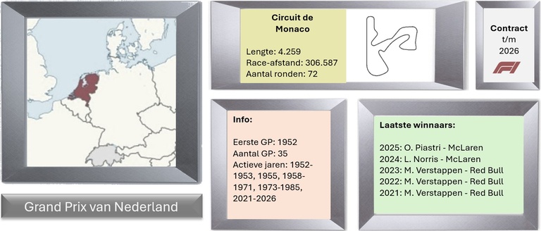 De Grand Prix van Nederland is een race uit de Formule 1 die tussen 1952 en 1985 dertig maal gehouden werd. De eerste twee jaren, 1948 en 1949, zijn er twee Grands Prix verreden als Grand Prix van Zandvoort, maar dit was nog geen F1. In de jaren 1950 en 1951 waren het wel F1 races maar die behoorden niet bij het officiële Formule 1 kampioenschap dat in 1950 begon. Na een afwezigheid van 35 jaar zou de race in 2020 terugkeren op Circuit Zandvoort, maar door de coronacrisis werd dit uitgesteld tot 2021. In 2026 zal deze reeks worden afgesloten vanwege financiële onzekerheden, en daarna komt dus de Grand Prix helaas niet meer (of voorlopig) terug in Nederland. Max Verstappen wist deze Grand Prix 3 keer te winnen.
