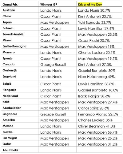 In 2024 werd Lando Norris 7 maal verkozen tot Driver of the Day. Hij werd hiermee glorieus winnaar van het klassement voor Charles Lerclerc, hij werd 5x gekozen. Carlos Sainz en Lewis Hamilton eindigden op de derde plaats met elk 3 uitverkiezingen. Max Verstappen werd slechts 1x gekozen door de fans/kijkers.