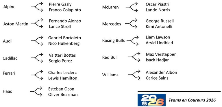 - Cadillac maakt ook zijn Formule 1-debuut als team, waardoor voor het eerst sinds 2016 weer elf constructeurs deelnemen. Cadillac zal met Ferrari-motoren rijden.