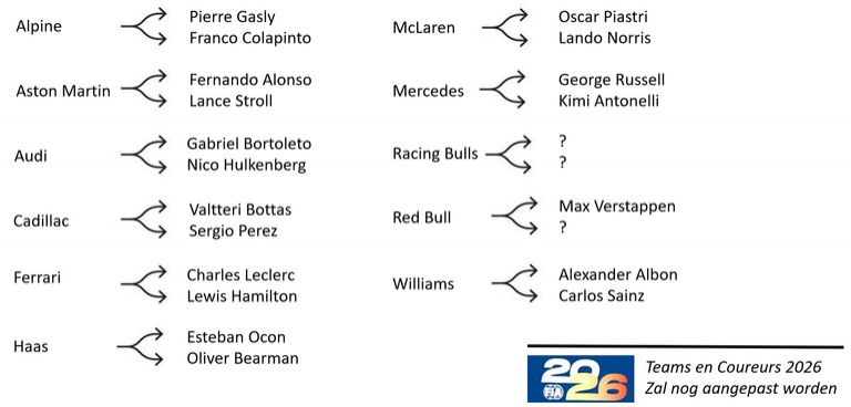 - Cadillac maakt ook zijn Formule 1-debuut als team, waardoor voor het eerst sinds 2016 weer elf constructeurs deelnemen. Cadillac zal met Ferrari-motoren rijden.