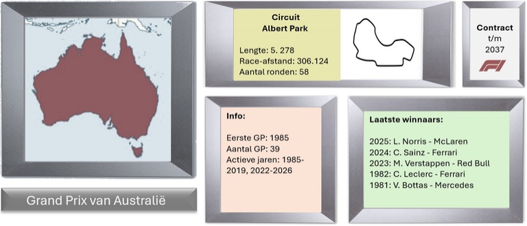 Info: De Grand Prix van Australië is een Formule 1 wedstrijd die wordt gereden op het Albert Park Circuit in Melbourne. Het was van 2011 tot en met 2019 de eerste wedstrijd van het F1 seizoen. Dit jaar mag het circuit na 2025 opnieuw de openingsrace organiseren. Deze GP werd voor het eerst gehouden in 1928. Het evenement vond op verschillende plaatsen in Australië plaats, totdat het in 1985 deel ging uitmaken van het F1 kampioenschap. Tot en met 1995 werd de Australische GP op het Stratencircuit van Adelaide verreden. In 1996 verhuisde het evenement naar het Albert Park Street Circuit in Melbourne. Michael Schumacher is met vier overwinningen de recordhouder van deze Australische Grand Prix. Max Verstappen wist deze Grand Prix 1 keer te winnen.