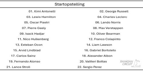 Kimi Antonelli kwalificeerde zich als jongste polesitter ooit in de geschiedenis van de Formule 1 op de polepositie voor de GP van China met naast hem teamgenoot George Russell. Daarachter was het vooral uitkijken naar beide Ferrari’s die ongetwijfeld een agressieve start gingen proberen maken. Een rij verder vonden we beide McLarens, dat was althans de bedoeling want voorafgaand aan de start vonden we beide McLaren-wagens in de garage want er was een probleem op beide wagens. Ook bij Audi-rijder Gabriel Bortoleto was er een probleem. Uiteindelijk zouden met Lando Norris, Oscar Piastri, Gabriel Bortoleto en Alex Albon maar liefst vier rijders niet aan de race beginnen.