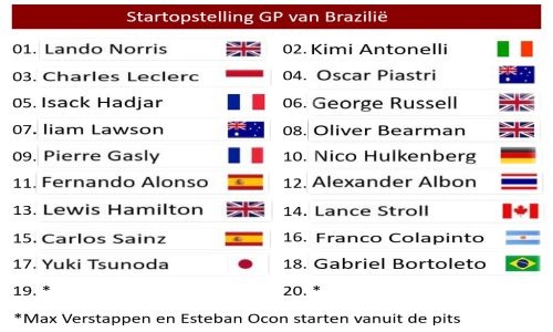 De kwalificatie voor de Formule 1 Grand Prix van Brazilië is zeer teleurstellend verlopen voor Max Verstappen. De viervoudig wereldkampioen kwam niet verder dan P16, terwijl Norris poleposition wist te pakken. Antonelli reed naar de tweede tijd, met Leclerc en Piastri daarachter. Daarna volgden Hadjar, Russell, Lawson, Bearman, Gasly en Hülkenberg. ....lees verder