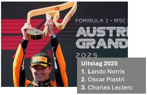 Lando Norris won de GP van Oostenrijk na een intense strijd met zijn teamgenoot Oscar Piastri. Charles Leclerc vervolledigde in de Ferrari het podium. Max Verstappen moest vlak na de start al opgeven nadat hij door Kimi Antonelli werd aangereden. Lewis Hamilton en George Russell maakten de top vijf compleet, waarna het tijd bleek voor de positieve verrassingen. Liam Lawson wist bijzonder knap met P6 aan de haal te gaan - een welkome vertrouwens boost voor de Nieuw-Zeelander. Fernando Alonso reed keurig met de Aston Martin naar de zevende plaats. Gabriel Bortoleto en Nico Hülkenberg hadden het met de plekken acht en negen ook lovenswaardig goed gedaan. Het laatste puntje werd binnen gehaald door Esteban Ocon.