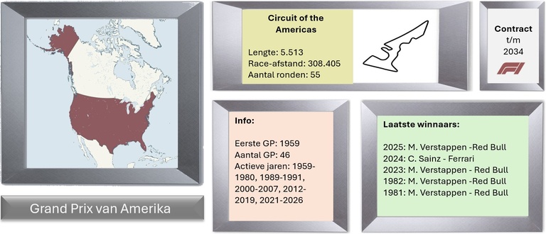 Het Circuit of The Americas (COTA) ligt in Austin en organiseert sinds 2012 de Grand Prix van de Verenigde Staten. Het circuit van 5,513 km (3,426 mijl) staat bekend om zijn uitdagende lay-out, hoogteverschillen en een mix van snelle rechte stukken en technische bochten, waardoor het een favoriet is onder coureurs en fans. COTA heeft een combinatie van hogesnelheidssecties en scherpe bochten die geïnspireerd zijn op beroemde circuits over de hele wereld. De belangrijkste hoogtepunten zijn de steile oprit naar Bocht 1, de snelstromende S-bochten in Sector 1 en het technische Bocht 15 Complex, die allemaal vaardigheid en precisie vereisen. Door het ontwerp van het circuit zijn er meerdere inhaalmogelijkheden en is de strategie heel belangrijk.