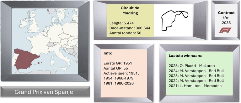 De Grand Prix van Spanje is een race uit de Formule 1 kalender. Sinds 1991 wordt er gereden op het Circuit de Catalunya in Montmeló, nabij Barcelona. Vanaf 2026 wordt de GP va Spanje gereden op het stratencircuit nabij Madrid, en dit is geen eenmalige happening: ze hebben een contract van tien jaar gesloten. Er zullen dus in elk geval tot 2035 Grand Prix races plaatsvinden in Madrid. Het nieuwe circuit wordt bevindt zich rondom het gebouw van IFEMA Madrid. De GP van Spanje werd voor het eerst gehouden in 1913 en maakt sinds 1951 deel uit van gt Formule 1. Michael Schumacher en Lewis Hamilton zijn samen de recordhouders van deze Grand Prix, met zes overwinningen elk. Max Verstappen wist deze Spaanse Grand Prix 4 keer te winnen.