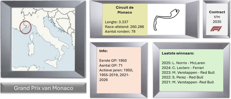 De Grand Prix van Monaco wordt gereden in de straten van Monaco, het Circuit de Monaco. De Grand Prix van Monaco wordt gezien als een klassieker en werd al gereden voordat de Formule 1 kampioenschappen bestonden. Tegenwoordig voldoet het circuit eigenlijk niet meer aan de moderne eisen van de Formule 1, er kan namelijk niet heel hard gereden worden en door de vele bochten is inhalen moeilijk. De race behoort samen met de 24 uur van Le Mans en de Indianapolis 500 tot de Triple Crown van de autosport en wordt gezien als een van de meest prestigieuze. Graham Hill en Michael Schumacher wisten hier 5 keer te zegevieren. Max Verstappen wist deze Grand Prix 2 keer te winnen.